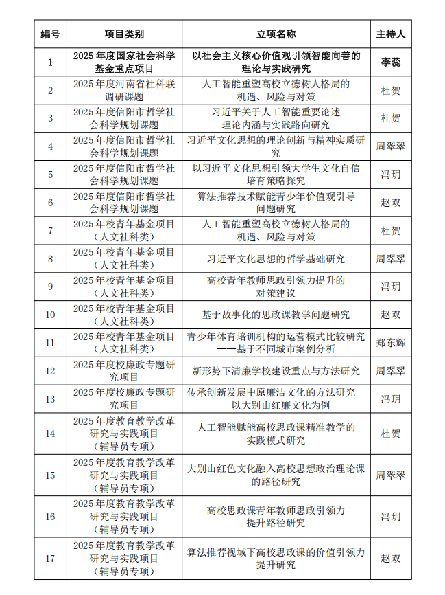 2025年人文学部共立项获批17项教科研项目,包括:国家社科基金重点项目1项、河南省社科联调研项目1项、信阳市社科联项目4项、校青年基金项目5项、校廉政专项项目2项、校教改思政专项项目4项。